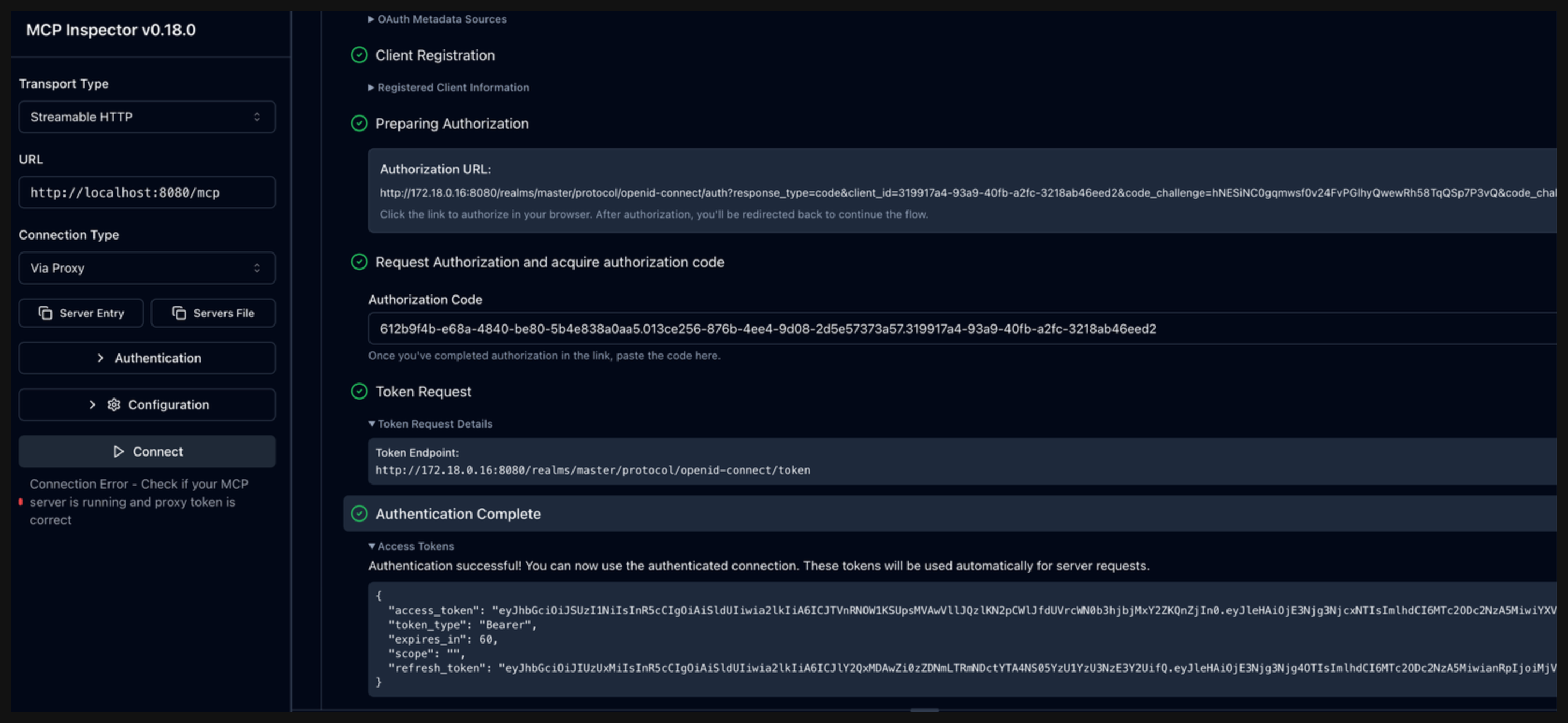 1. In the OAuth Flow Progress card, click Continue to start the Metadata Discovery phase. Verify that the step succeeds and that you see the authorization server metadata. The metadata include information about the location of the authorization server, supported scopes, and ways to provide the bearer token.
