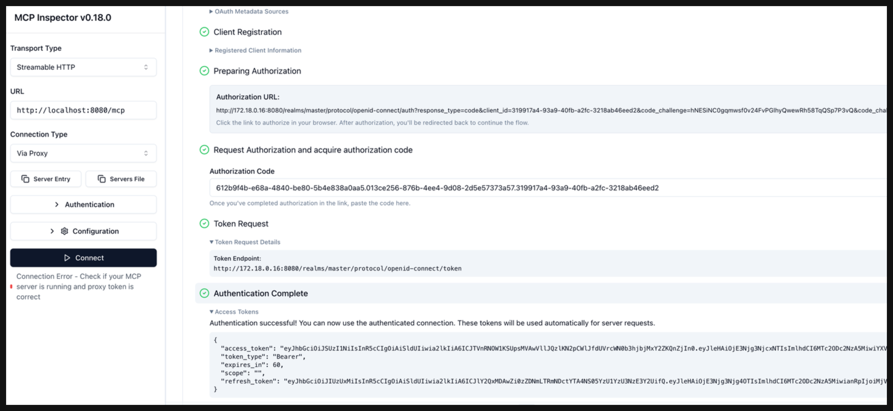 In this guide, you explore how to configure the agentgateway proxy to protect a static MCP server with MCP auth by using Keycloak as an identity provider. To authenticate with the MCP server, MCP clients such as the MCP inspector tool, can dynamically register with the identity provider to obtain a client ID. Then, the MCP client uses the client ID during the OAuth flow to obtain the JWT token. Finally, the MCP client uses the JWT token to authenticate with the MCP server and access its tools.