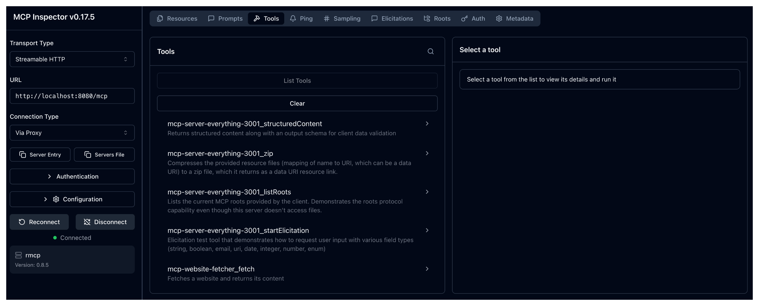 2. From the terminal, run the MCP Inspector command. Then, the MCP Inspector opens in your browser.